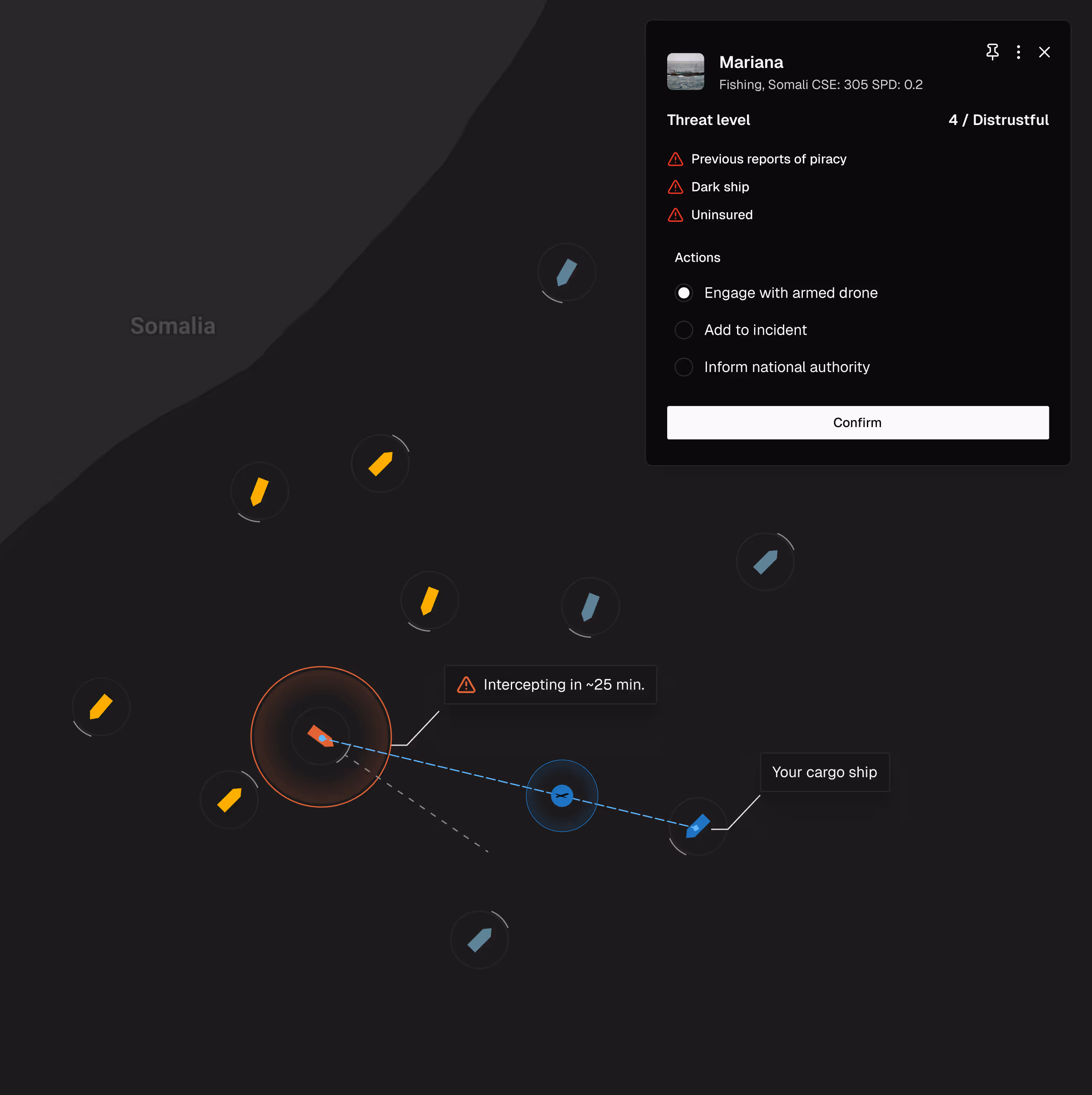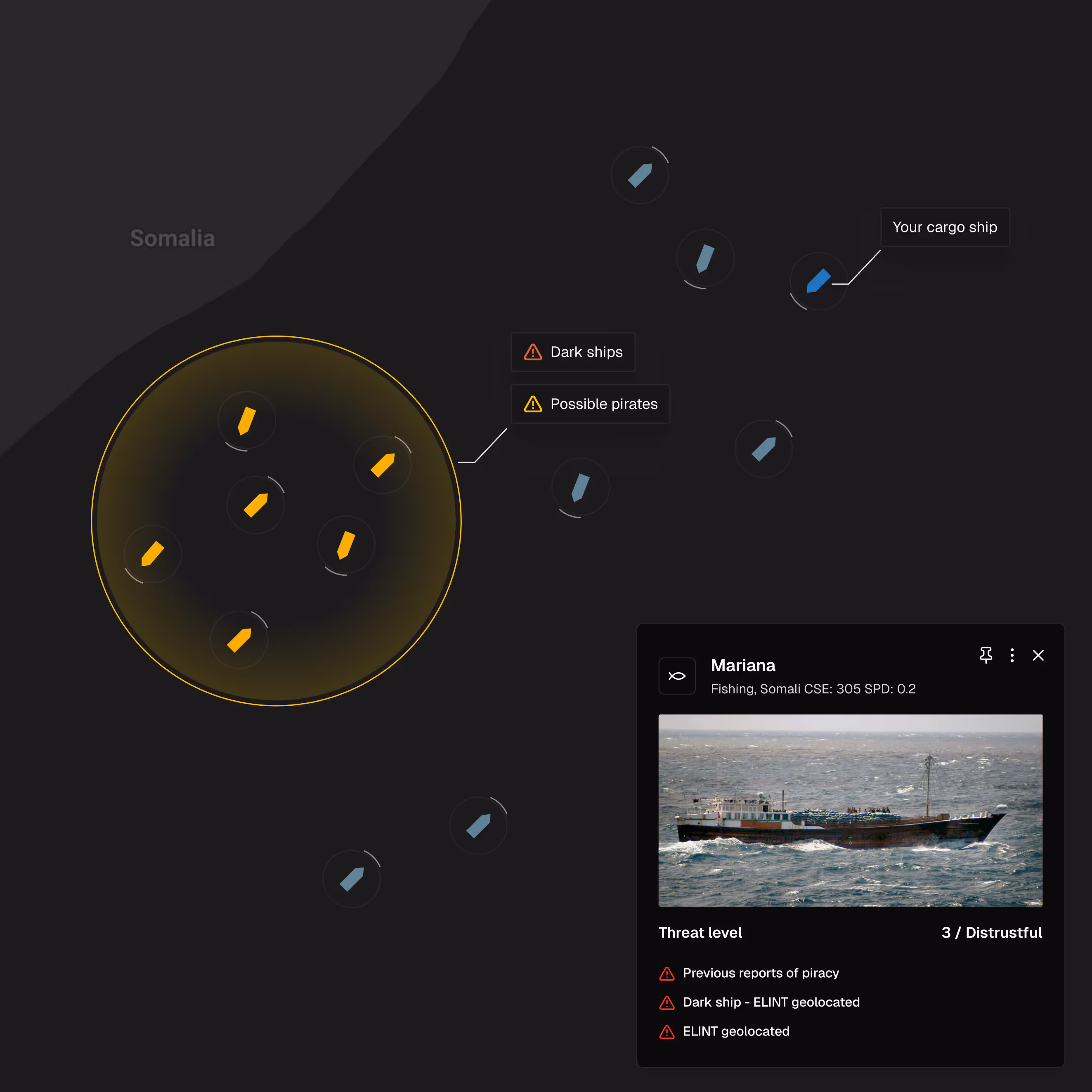 Shipping operators gain continuous situational awareness of fleets and routes, with vessel threat scoring and alerts in high-risk areas. This reduces exposure to piracy, spoofing, and operational disruptions.